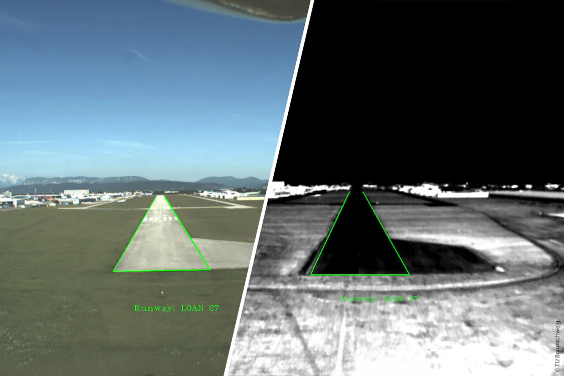 Ziel der Forscherinnen und Forscher der TU Braunschweig und weiterer Projektpartnern war es, eine vollständig automatische Landung von eVTOLs (elektrisch angetriebene Fluggeräte, die senkrecht starten und landen können) sowie Flächenflugzeugen zu ermöglichen. Merkmale der Landebahn wie Seitenlinien oder Schwellen sollten sicher erkannt und die relative Position des Flugzeugs zuverlässig daraus abgeleitet werden. Das Thermografiesystem VarioCAM® HD head von InfraTec ergänzt dabei eine RGB-Kamera, denn die ist bei schlechten Sichtverhältnissen wie Dunst, Dämmerung oder Gegenlicht häufig „blind“.